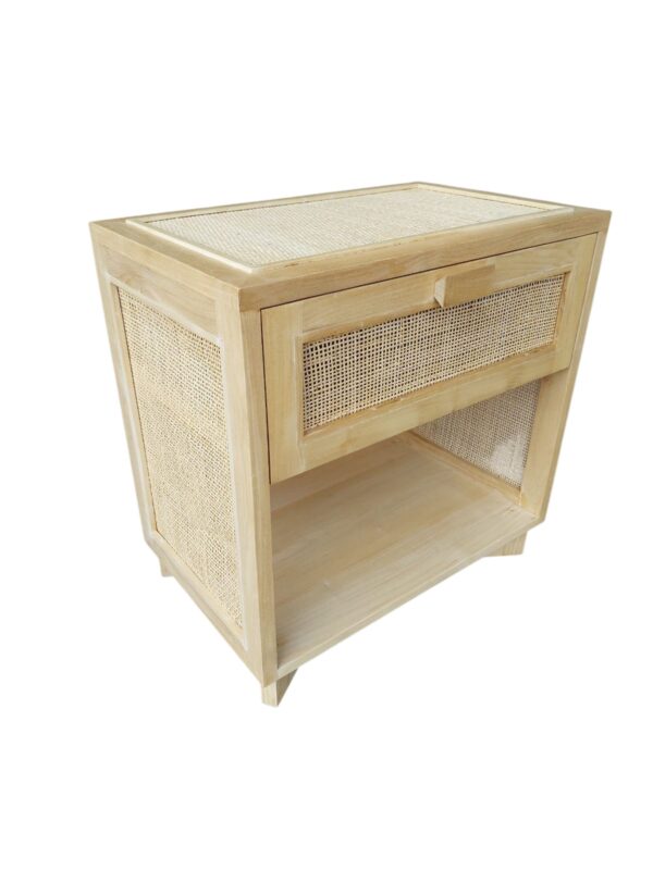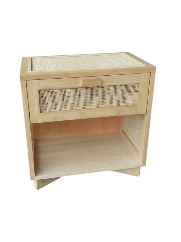 Price listed is for a set of 2 nightstands. 25″ W x 16″ D x 25″ H Material: Teak, Cane Color: Natural/Brown
