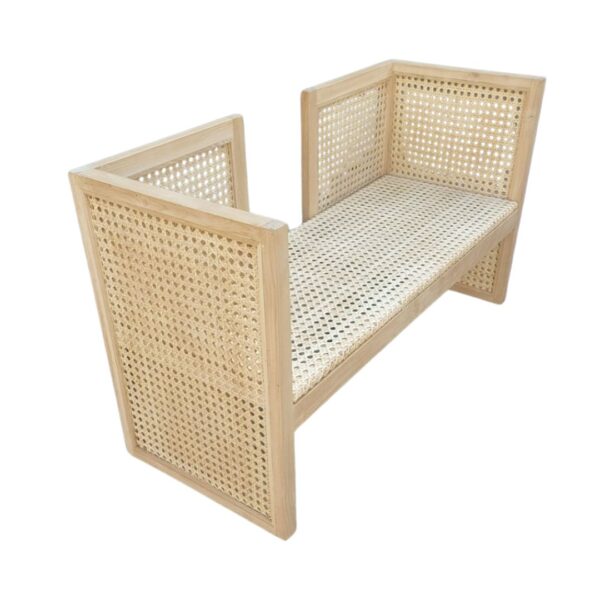 55″ L x 22″ D x 32″ H Material: Cane, Teak Color: Natural/Brown Cushion Color: White